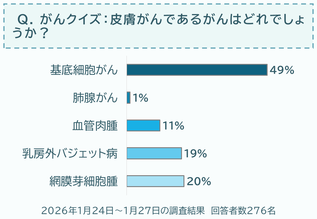 今回のクイズでは「皮膚がんであるがんはどれでしょうか?」と選択肢の中から該当すると思うがん種を選んでいただきました。