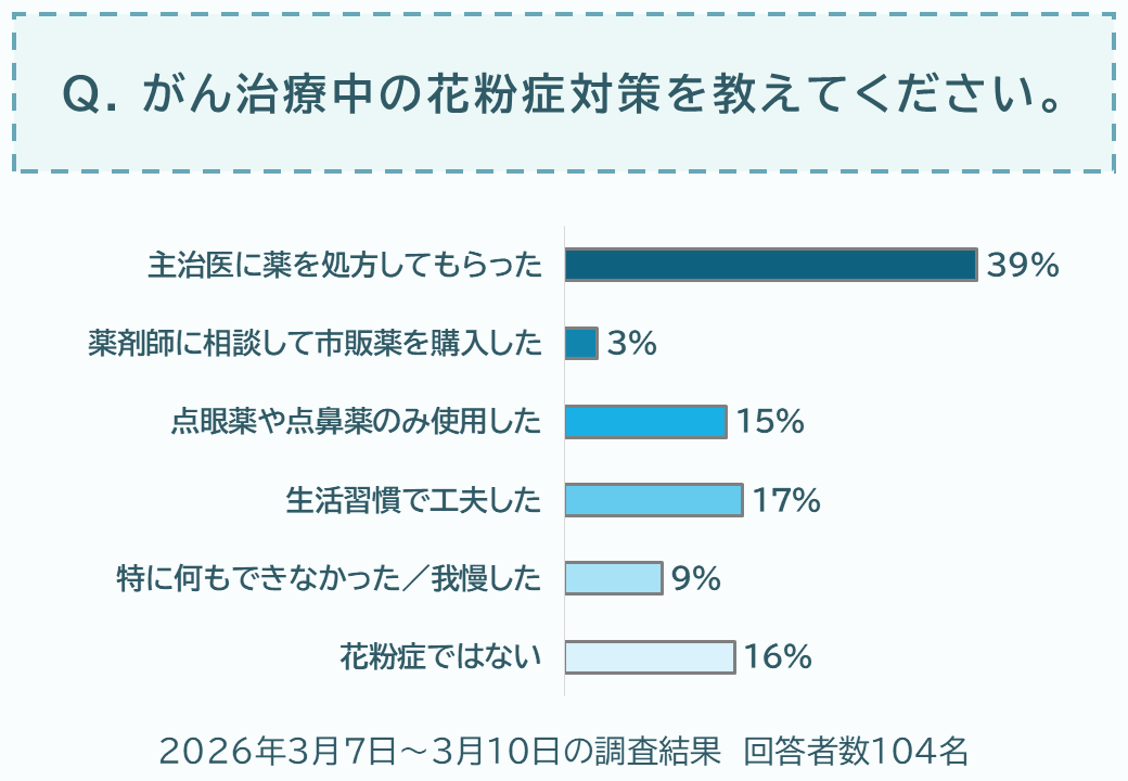 ・がん罹患以前から花粉症だったので、その時期になって症状が出たら耳鼻咽喉科で処方された薬を使ってます。がんの主治医には相談しません。自分の持ち分の範囲外だと言うことしか言ってくれないので。