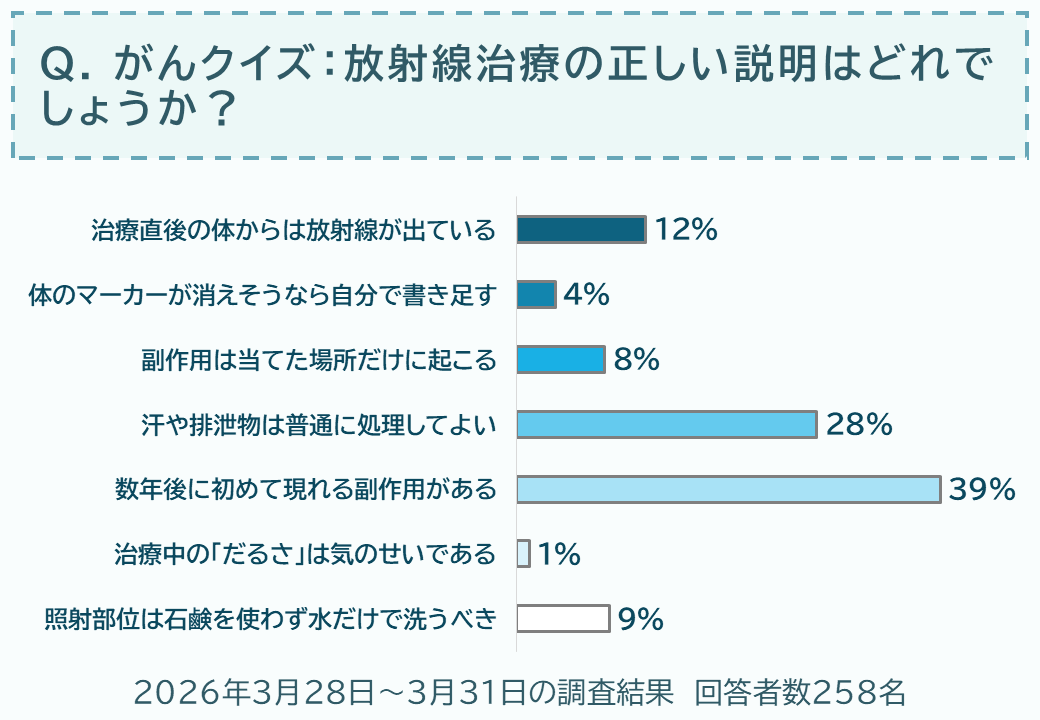 今回のクイズでは「放射線治療の正しい説明はどれでしょうか?」というテーマに対し、選択肢の中から正しいと思う放射線治療の説明を選んでいただきました。