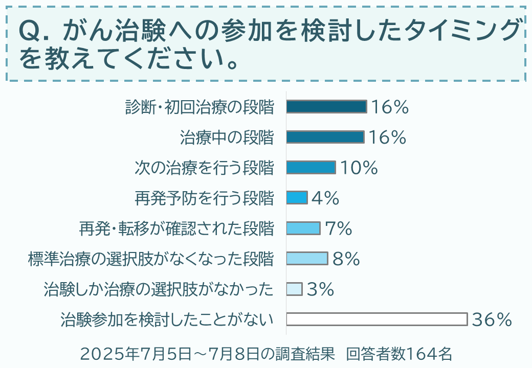 今回のオンコロ・ワンクエスチョンをご回答いただいた方の中では、上記のタイミングのほか、診断時や初回治療時に検討された方も多くいらっしゃいました。