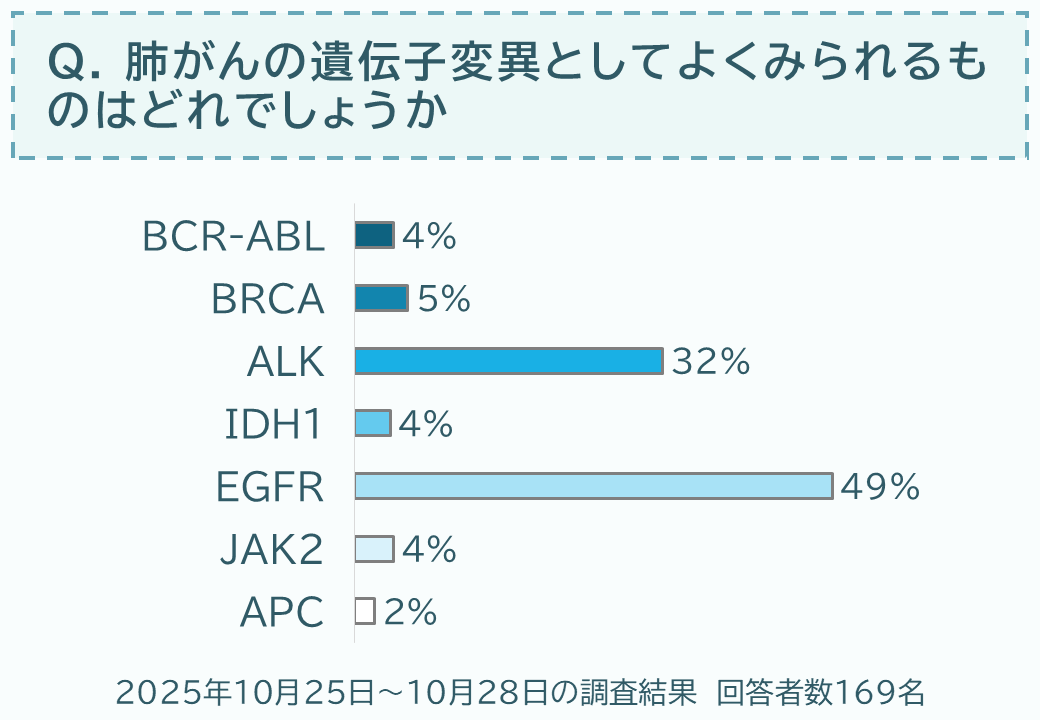 「肺がんの遺伝子変異としてよくみられるものはどれでしょうか。すべてをご選択ください」という質問に対する適切な選択肢は「ALK」と「EGFR」の遺伝子変異になります。今回のオンコロ・ワンクエスチョンにご参加いただきました方の多くが、正解を選択されている結果となりました。
