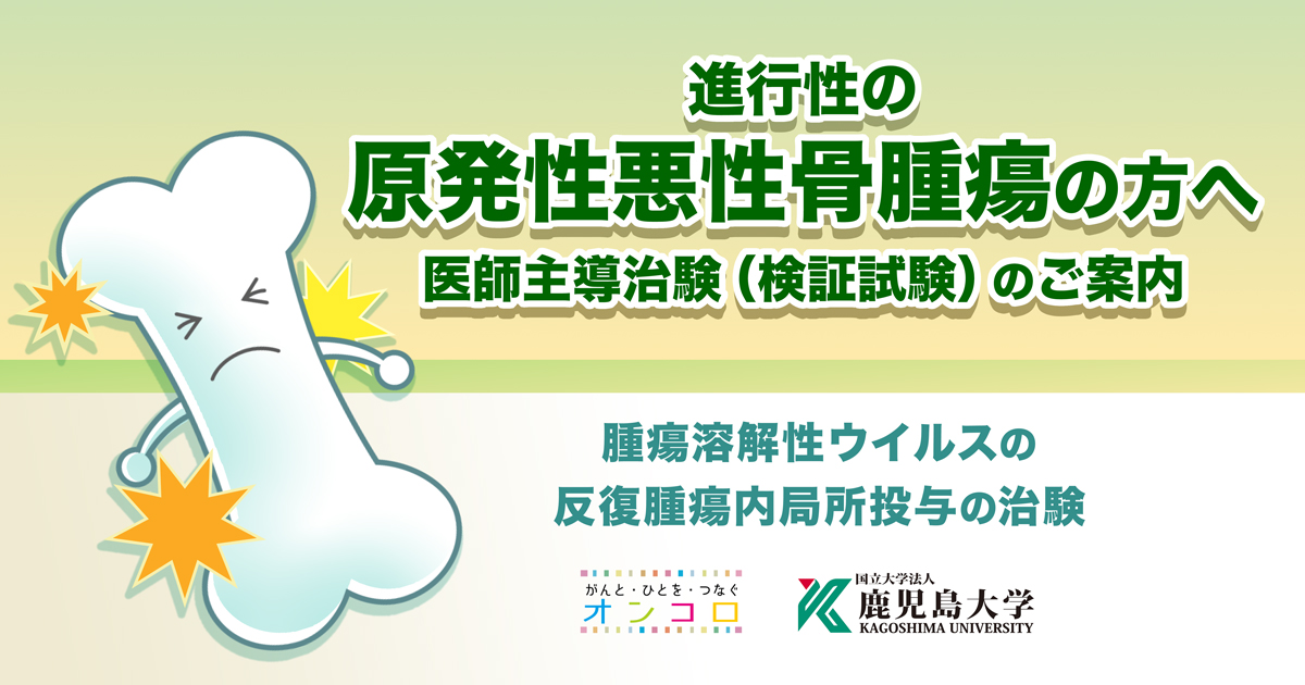 本治験は標準的な放射線療法及び化学療法では効果がなく、手術による切除が難しい進行性の原発性悪性骨腫瘍の患者さんを対象とした、腫瘍溶解性ウイルスの医師主導治験です。