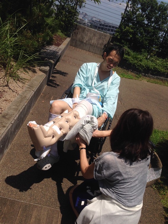 手術後、まだ強い痛みを伴い車椅子生活での入院生活の様子