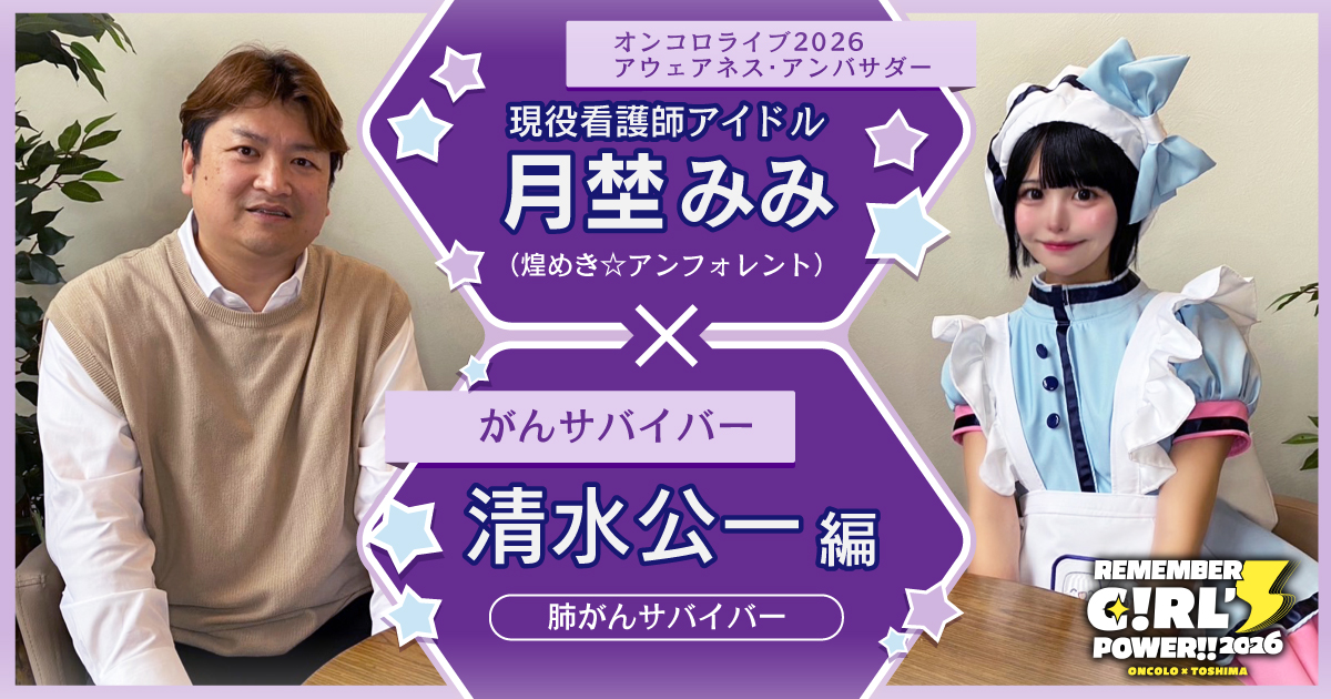 オンコロライブ2026のアウェアネス・アンバサダーを務める月埜みみさん(煌めき☆アンフォレント)が、がんを経験した方々の「その後の人生」に向き合うインタビューシリーズ。第4回目のゲストは、肺がんを経験し、治療とともに歩みながら新たな道として社会保険労務士の資格を取得された清水公一さんです。