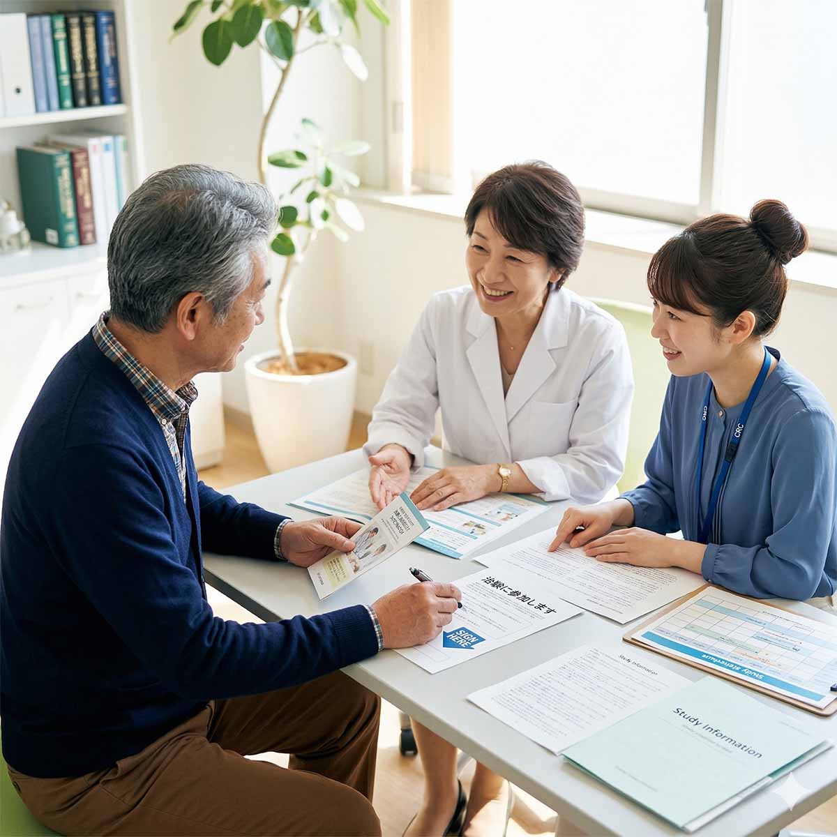 2023年2月10日、大学病院を初めて受診しました。大学病院のような大きな施設では、最初は若い先生が担当されることが多いのですが、14日の2回目の診察では、後に血液内科長になられる女性の先生が担当してくださいました。その際、一緒に治験コーディネーターの方が同席しており、治験への参加を提案されました。