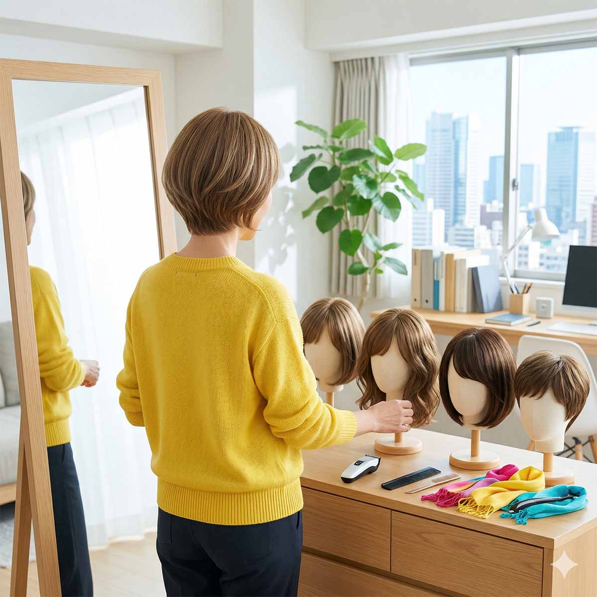 また、最初に用意した人毛100%のウィッグは手入れが大変で、不自然に見えてしまうことが悩みとなりました。そこで、人工毛を混ぜたタイプなど、扱いやすいものをネットなどで買い足していきました。現在は計6種類のウィッグを所有し、用途や気分に合わせて使い分けています。出社用には長時間つけていても頭が痛くならないサイズのもの、休日にはスタイルを大きく変えたものなど、状況に応じて選んでいます。