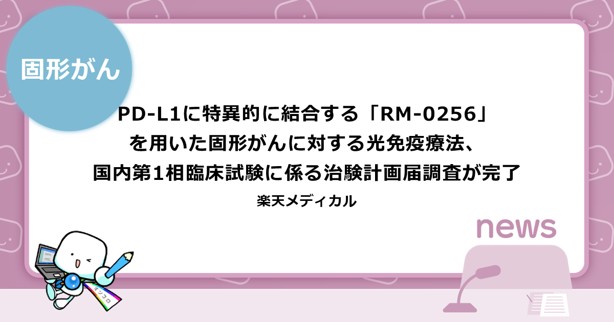 PD-L1に特異的に結合する「RM-0256」を用いた固形がんに対する光免疫療法、国内第1相臨床試験に係る治験計画届調査が完了