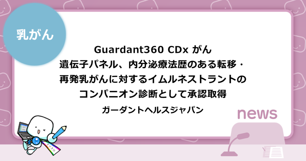 ガーダントヘルスジャパン株式会社は2025年12月22日、包括的がん遺伝子パネル検査「Guardant360(R) CDx がん遺伝子パネル(以下、Guardant360 CDx)」について、内分泌療法後に増悪したホルモン受容体(HR)陽性かつHER2陰性の手術不能または再発乳がんに対するイムルリオ(一般名:イムルネストラントトシル酸塩)の適応判定を補助するコンパニオン診断システムとして、厚生労働省より承認を取得したことを発表した。