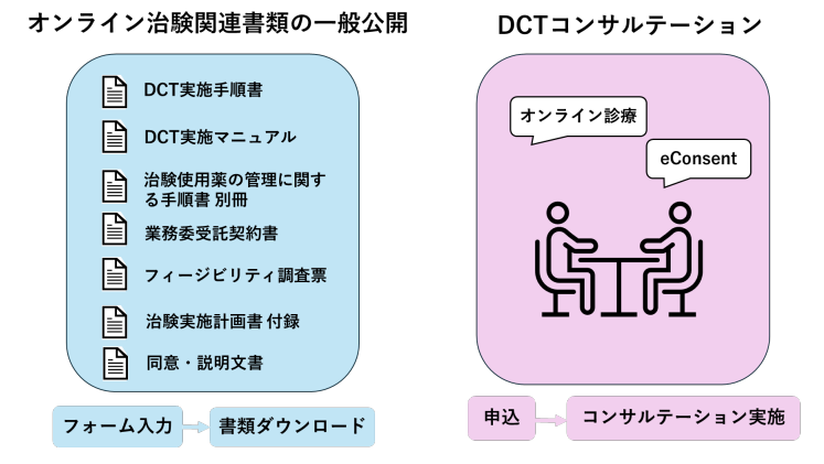 具体的なDCTコンサルテーションの内容は、実務書類を無償提供することに加え、オンライン診療や、eConsent(治験の内容説明や同意取得を電子機器で行う手法・手順)、ePRO(電子機器を使った患者報告アウトカム)に関するシステムやウェアラブルデバイス等の適切な選定、データ転送のためのシステムの構築、医薬品の臨床試験の実施の基準に関する省令および各種ガイドライン等の規制対応、運用面での課題解決など、多岐にわたるご相談に対応するとしている。