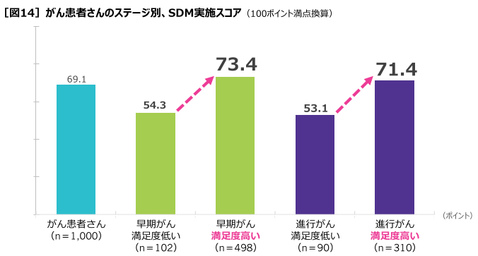 結果2:選択した治療方法の満足度が高い(後悔が少ない、納得している)患者さんほど、SDM実施スコアが高い