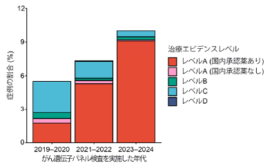 この治療実施割合はがん種によって大きな差が見られ、甲状腺がん(34.8%)、非小細胞肺がん(20.3%)、小細胞肺がん(20.1%)では高い割合を示したが、膵がん(1.3%)、肝臓がん(1.8%)、消化管間質腫瘍(2.7%)などでは低い結果となった。ただし、検査実施時期別に見ると、2019~2020年の5.5%から、2023~2024年には10.0%へと上昇しており、標的治療を受けられる患者の割合は増加傾向にあることが示された。